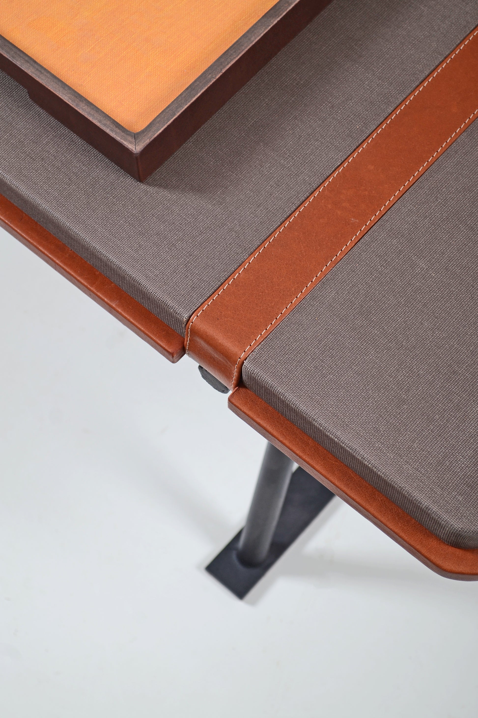 Estructura confeccionada en Hierro negro, tapizada con lino tratado y detalles de cuero.