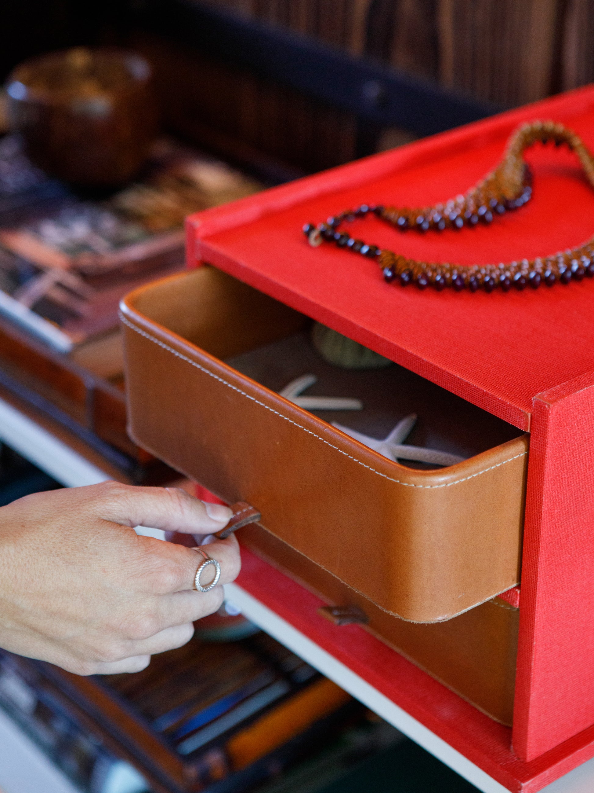 Confeccionado en lino tratado & cuero lustrado en cajones.
