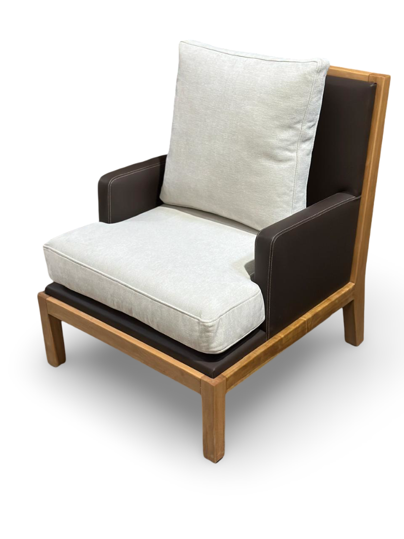 Madera de lenga maciza, cuero de tapiceria & almohadones en tela antimancha