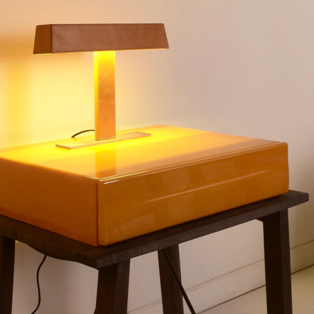 Patas en madera de lenga natural oscura y cajon en pashmina laqueada.